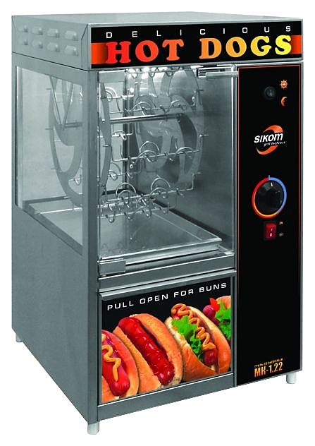 Гриль электрический для хот-догов Сиком МК-1.22 предназначен для приготовления хот-догов в заведениях быстрого питания и уличной торговли. Прибор рекомендуется использовать при температуре окружающей среды от 10 до 35 °С под навесом или в закрытых помещениях, имеющих вентиляцию. Оборудование состоит из двух отделений: верхнее служит для приготовления и разогрева сосисок, нижнее, с выдвижным ящиком, - для подогрева булочек. На панели управления расположены: рукоятка регулятора температуры, клавиши выключателя подсветки и вращения вертела.