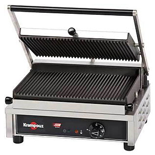 Гриль контактный Krampouz GECID4AO настольный имеет рифлёные нижнюю и верхнюю рабочие поверхности с 1 зоной нагрева. Размер рабочей поверхности - 350х230мм. Площадь рабочей поверхности - 0,08кв.м. Рабочая температура - +50/+300С. Температура нагрева регулируется термостатом. Рабочие поверхности изготовлены из износостойкой эмалированной литой стали. Сила давления верхней поверхности регулируется. Самоуравновешивающаяся верхняя поверхность автоматически подстраивается под толщину продукта. Нижняя рабочая поверхность за 25сек. заменяется на гладкую (приобретается отдельно). Поверхности можно мыть в посудомоечной машине, они полностью снимаются за 45сек. Гриль оснащён съёмным поддоном для крошек. Запатентованная система нагрева распределяет тепло равномерно по всей рабочей поверхности. Корпус гриля изготовлен из нержавеющей стали.