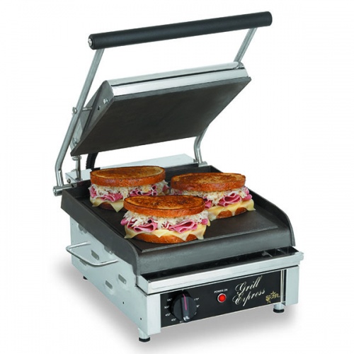 Прижимной настольный гриль оснащен чугунной гладкой рабочей поверхностью, электромеханическим управлением и таймером. Корпус изготовлен из нержавеющей стали, материал жарочной поверхности чугун.
