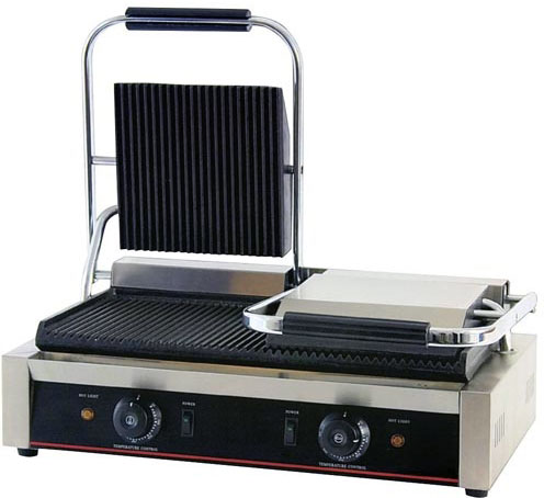 Прижимной, двухсекционный гриль оснащен тремя ребристыми пластинами и 2-мя независимыми терморегуляторами температуры для одновременного нагрева жарочных поверхностей, что делает приготовление быстрым и полезным.