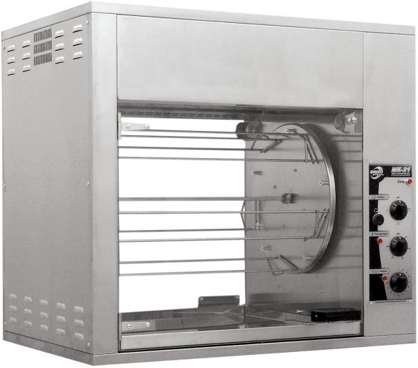 В верхней части рабочей камеры располагается вентилятор и нагревательные элементы. Предусмотрена возможность комбинирования режимов конвекции и ИК-нагрева. Благодаря использованию принципа конвекции продукт остается сочным и сохраняет больше полезных и питательных веществ. На механической панели управления можно регулировать температуру и выбрать удобный режим тепловой обработки. В нижней части рабочей камеры находится поддон, оснащенный сливным краном.