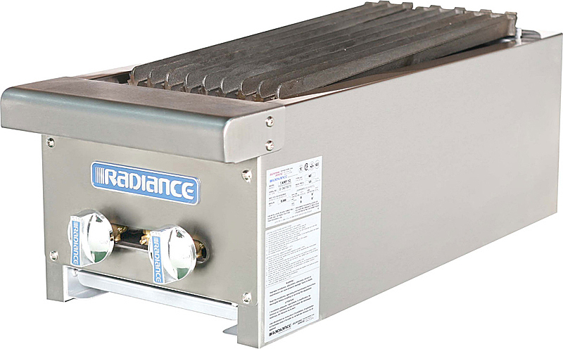 Плита газовая, промышленная, модельный ряд "RADIANCE". Предназначена для общепита. 2 газовых конфорки, без духовки, с грилем. Материал накладок и решеток - чугун. Материал корпуса - нерж. сталь.
