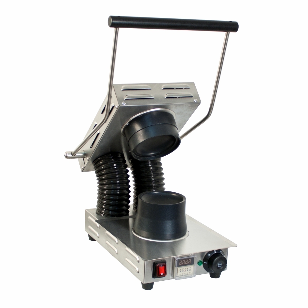 Также оригинальная конструкция форм для спекания позволяет не только «спаять» края лепешки или тоста, но и отрезать лишнюю внешнюю часть лепешки и создать «Г» образный рельеф шва спекания, повышающий надежность соединения. Устройство снабжено таймером для фиксации времени приготовления, которое является критическим фактором данной технологии.