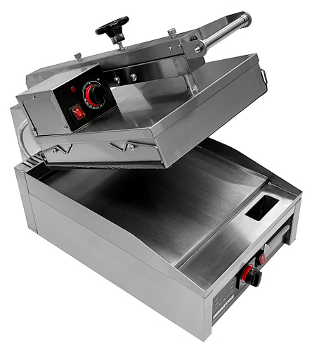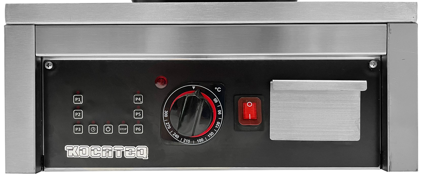 Гриль пресс Kocateq GH33ED (2024) односекционный полуавтоматический для жарки стейков и гамбургеров со съемной тефлоновой стеклотканью предназначен для жарки мяса, птицы, рыбы и овощей, приготовления стейков, гамбургеров и горячих сэндвичей на предприятиях общественного питания и торговли. Модель оснащена цифровой панелью управления, аналоговыми термостатами для регулировки температуры, съемным лотком для сбора жира. Корпус выполнен из нержавеющей стали, ножки - из пластика, нижняя пластина - из теплопроводящего сплава, верхняя пластина покрыта сменной тефлонированной стеклотканью.