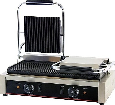 Рабочая температура регулируется термостатом. Двусторонний нагрев значительно сокращает время приготовления того или иного блюда. Верхняя часть регулируется по высоте, что позволяет подогревать и обжаривать продукты разного размера и толщины.