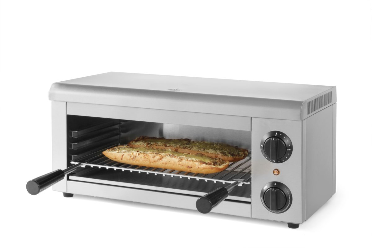 Гриль-саламандра Gastrorag AT-936E – это техника для приготовления блюд на профессиональной кухне. Электрический гриль саламандер для кафе относится к бесконтактному типу и имеет только верхний нагрев, который осуществляется металлическим нагревательным элементом. Электрогриль предназначен для запекания, доготовки блюд, придания им аппетитной золотистой корочки и поддержания в горячем состоянии до момента подачи посетителям. С его помощью можно приготовить курицу, стейки, горячие бутерброды, тосты. Гриль саламандр электрический Gastrorag AT-936E отличается несложной конструкцией и простотой в эксплуатации. Он представляет собой закрытую с 3-х сторон камеру с четырьмя парами направляющих. Продукты размещаются на решетке, а направляющие позволяют регулировать ее высоту относительно нагревательного элемента, тем самым увеличивая или уменьшая интенсивность нагрева. Температура регулируется ручкой термостата в диапазоне 50-300оС. Предусмотрен также 15-минутный таймер. В нижней части камеры располагается съемный поддон для сбора жира и остатков пищи. Корпус гриля электрического открытого изготовлен из нержавеющей стали.
