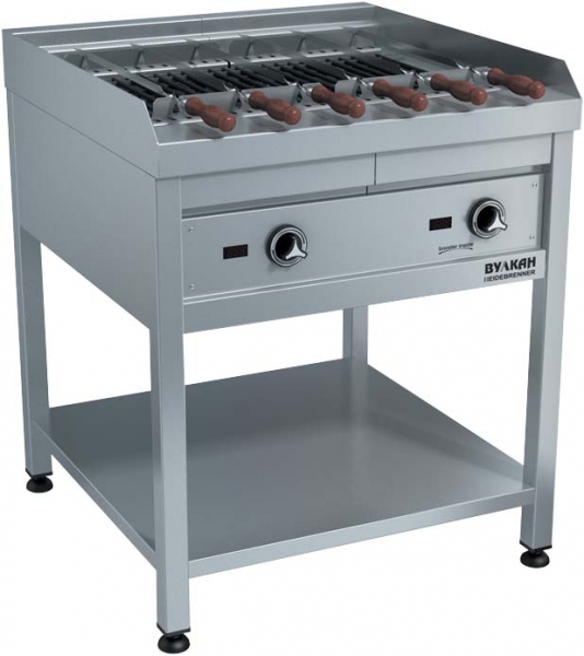 Гриль-шашлычница электрическая Вулкан (Heidebrenner) ETK-BST2 «Иджен» с 2 зонами нагрева по 5400Вт оснащён плавной регулировкой мощности, лавовыми камнями, выдвижными поддонами для сбора жира, открытым стендом со сплошной полкой. Вместимость - 6 шампуров.