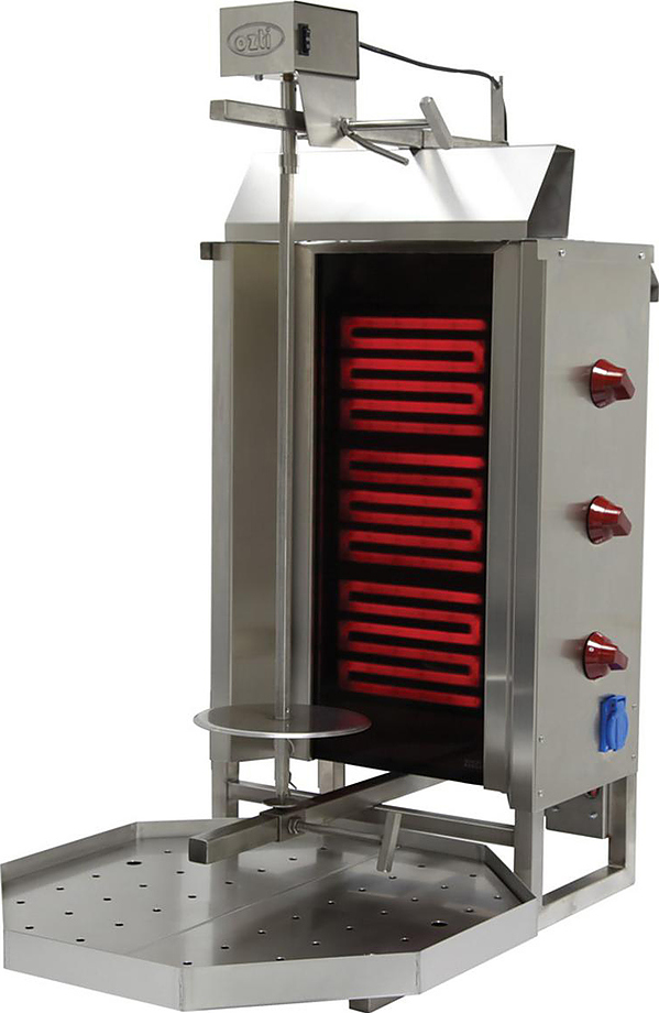 Гриль-шаурма Ozti 3E предназначен для обжарки большого количества различных видов мяса и птицы на предприятиях общественного питания, а также в производственных цехах, деятельность которых связана с выпуском гастрономических товаров. Корпус выполнен из нержавеющей стали, панель перед нагревательными элементами - из керамического стекла.