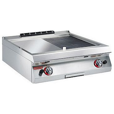 Гриль-сковорода имеет округленные углы, декоративные ручки с накладками из нержавеющей стали, поставляется с предварительно установленными кабелями и вилками. Гладкая жарочная поверхность из сплава Fe510D герметично вварена в рабочую поверхность и отполирована под сатин. Жарочная поверхность слегка углублена в рабочую поверхность. Две зоны нагрева.