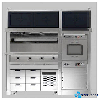 Гриль-станция электрическая ТТМ ГСЧ-4ЭМ2Л предназначена для приготовления мясных, рыбных, овощных блюд на гриле в ресторанах, кафе и других заведениях общепита. Данное оборудование имеет одну жарочную зону, вмонтированный слева электрогриль с четырьмя жарочными поверхностями по 3 кВт каждая, нишу для холодильного стола на колесах Skycold под грилем, вытяжной зонт наверху с лабиринтными фильтрами, полки-решётки для поддержания температуры готовых продуктов и нишу в середине для двух печей ISTOMA-EM, устанавливаемых одна на другую.