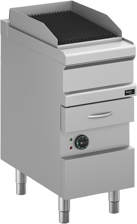 Пар, образующийся за счёт испарения воды из ёмкости, расположенной под рабочей поверхностью, предохраняет от пригорания. Сочетание увлажнения и высоких температур максимально сохраняет полезные свойства приготовленных продуктов, придаёт им мягкость и сочность. Оснащён регулируемыми по высоте ножками. Столешница, вентиляционная решётка и передняя панель выполнены из нержавеющей стали AISI 304 толщиной 1 мм, боковые и задняя панели – из нержавеющей стали AISI 430 толщиной 1 мм, решётка – из чугуна.