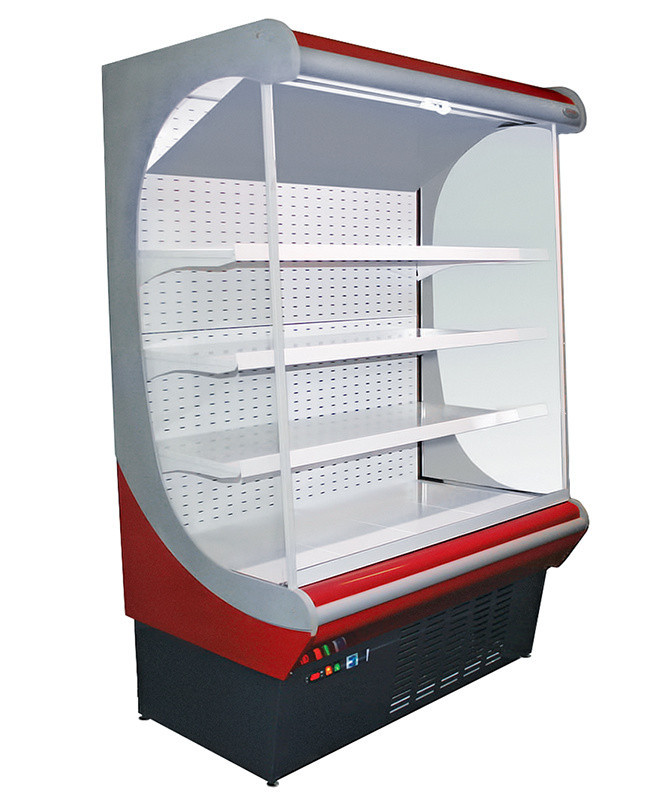 Модель оснащена 4 рядами полок с ценникодержателями, боковыми стеклопакетами, верхней подсветкой внутреннего объема и шторками.
