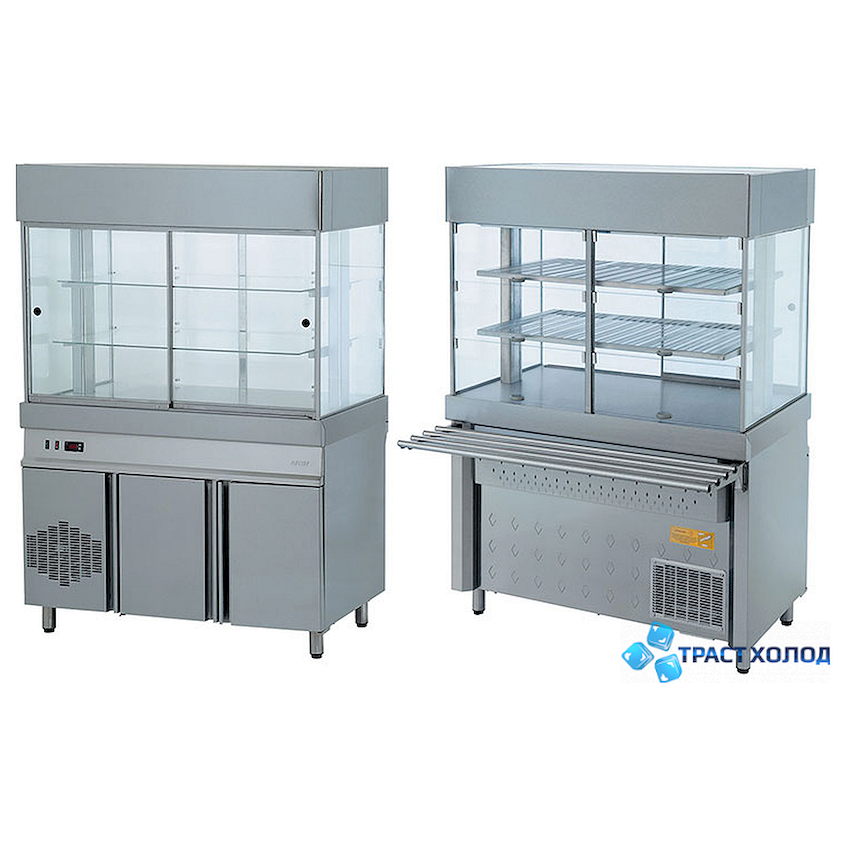 Испаритель холодильного агрегата расположен в верхней части холодильного прилавка, благодаря этому, захолаживание объема камеры происходит достаточно быстро и холодильный агрегат работает более экономично. Поднимающиеся дверцы витрины обеспечивают удобное извлечение блюд из нее, 6 дверей со стороны обслуживающего персонала позволяют пользоваться всем объемом камеры без общей потери холода. Полки в холодильной витрине выполнены из нержавеющих решеток, что позволяет осуществлять уборку внутри камеры, а также беспрепятственно захолаживать объем.