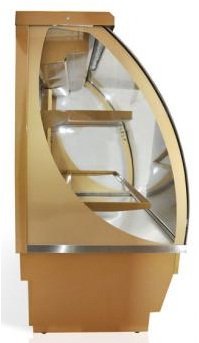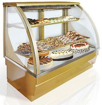 Фронтальное стекло имеет выгнутую форму, что придает элегантный вид витрине. Светодиодная подсветка красиво подсвечивает полки и нижний уровень. Отлично подходит для кафе, баров, кондитерских и магазинов любого формата.