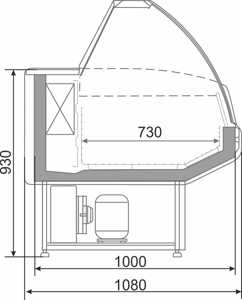 Модель оснащена двойным стеклопакетом, подсветкой и шторками. Столешница выполнена из декоративной нержавеющей стали, корзины выкладки - из стали, покрытой пластизолью, шторки - из оргстекла.