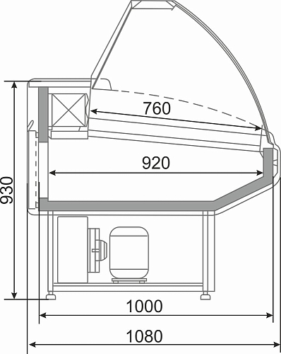 Модель оснащена дополнительным холодильным отделением, подсветкой внутреннего объема и шторками. Столешница выполнена из декоративной нержавеющей стали, выдвижные противни выкладки - из нержавеющей стали, полки - из стекла, шторки - из оргстекла.