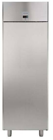 Холодильный шкаф ELECTROLUX RE471FR 727292, гастронормированный GN2/1, линии Ecostore с вентилируемой системой охлаждения, цифровым дисплеем, 1 глухой распашной дверью изготовлен из нержавеющей стали AISI 430. Объём - 670л. Рабочая температура: 0/+6С (при температуре в помещении до +43°C). Хладагент - R134a, 130г. Количество уровней - 44 с шагом направляющих - 30мм. В комплекте - 3 полки-решетки GN2/1 с рельсановым покрытием и пара направляющих. Шкаф имеет съемный трехкамерный уплотнитель с магнитной вставкой, изоляцию испарителя толщиной 60мм, автоматическое испарение талой воды горячим газом, автоматическую оттайку, штампованную внутреннюю конструкцию со скругленными углами, запираемую дверь, которая открывается на 180град и закрывается самостоятельно, регулируемые по высоте ножки (110-165мм), цифровой дисплей с отображением температуры внутри камеры и режимом принудительной оттайки (цикл оттайки можно запустить вручную при необходимости), звуковыми и визуальными сигналами в случае температурных отклонений. Принудительная циркуляция воздуха от задней стенки агрегата и съемные воздуховоды обеспечивают равномерное распределение температуры и быстрое охлаждение. Циклопентановая изоляция стенок рабочей камеры толщиной до 75мм исключает энергопотери и на 100% безопасна для окружающей среды. Во избежание утечки холодного воздуха, при открытой дверце работа вентилятора приостанавливается. Нижняя часть агрегата устойчива к коррозии и агрессивному воздействию химических средств для мытья полов.