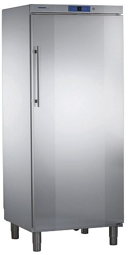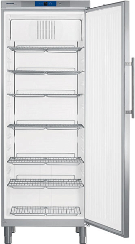 Холодильный шкаф Liebherr GKV 6460 и его глухая дверца изготовлены из нержавеющей стали, а внутренний корпус бесшовный пластиковый, со сливным отверстием и формованными опорными ребрами. Полки стандарта Gastronorm 2/1 переставляемые и чрезвычайно прочные, что позволяет размещать на них высокие и тяжелые контейнеры. Ножки регулируются по высоте от 15 до 18 см. Дверные петли переставные (справа налево), компактная ручка эргономична. Данные особенности обеспечивают максимальное удобство использования прибора.