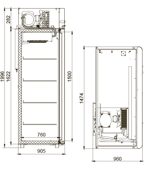 Имеет цельнозаливной пенополиуретановый корпус без щелей и стыков, гарантирующий надежную термоизоляцию охлаждаемого пространства, механическую прочность и долговечность шкафа.