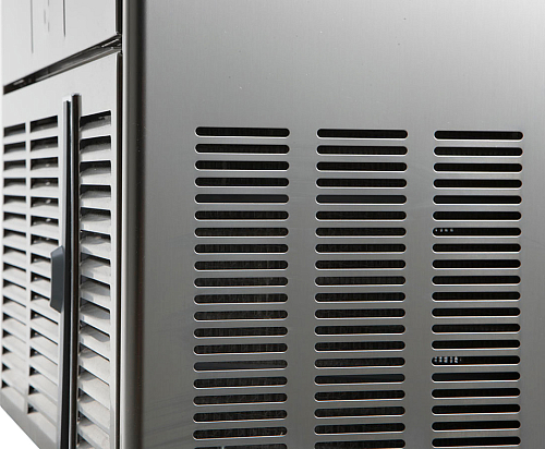 Льдогенератор оснащен встроенным бункером для льда, корпус полностью выполнен из нержавеющей стали с закругленными углами. Дефлектор не препятствует открытию двери — это исключает какие-либо поломки при ее открытии.