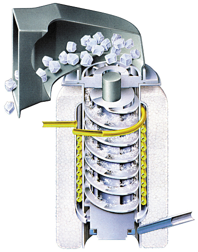 Модель оснащена вертикальным цилиндром с внутренним шнеком, который очищает лед от внутренней поверхности испарителя, подняв его до выхода, где есть ледокол.