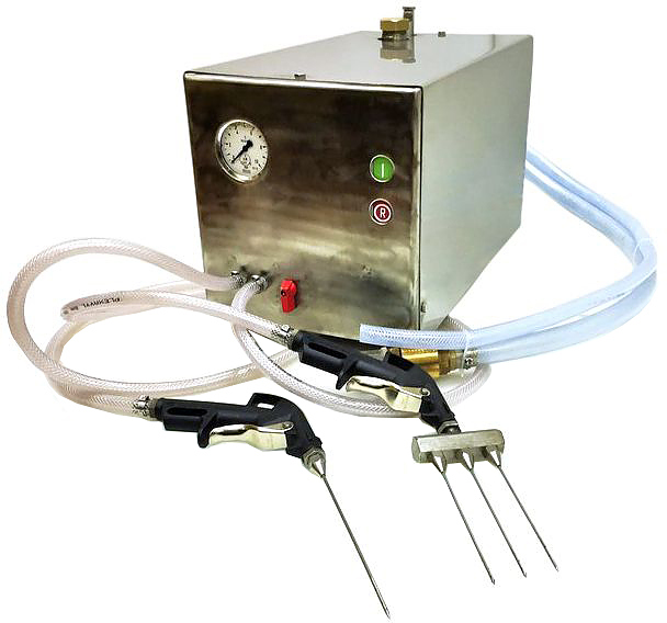 Инъектор для посола типа ФИП марки ФИП-5 (ручной). Осуществляет посол костного и бескостного мяса говядины, свинины, баранины, конины, оленины, а также мяса птицы и рыбы. В комплект поставки входит итальянский электронасос, два пистолета, заборник рассола с фильтром. Инъектор снабжен регулятором давления и манометром, что позволяет контролировать и регулировать подачу рассола в сырье под давлением от 0.5 до 3-х бар. Иглы взаимозаменяемые, что делает инъектор универсальным. Стандартная комплектация включает два пистолета с 1-й и 3-мя иглами соответственно, каждая игла имеет 6 отверстий, имеет длину 180 мм, диаметр 4 мм. Под заказ можно укомплектовать пистолеты двойными иглами, а также иглами различных диаметров 2,5 мм, 3мм и 4 мм. Работа насоса контролируется защитным автоматом, что делает инъектор безопасным в работе.