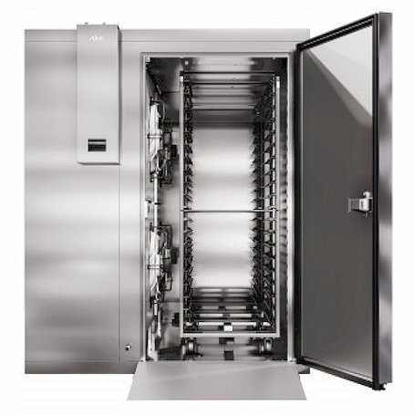 Камера шоковой заморозки Abat ШОКК-202 предназначена для быстрого охлаждения и замораживания различных пищевых продуктов и полуфабрикатов для дальнейшего их хранения на низкотемпературных складах предприятий общественного питания. Модель оснащена 2 воздухоохладителями с 2 вентиляторами каждый, навесной дверью с низкотемпературным уплотнителем, подогревом и двусторонним замком. Пандус и пол камеры выполнены из рифленого нержавеющего листа, стенки и потолок - сендвич-панели из высококачественной нержавеющей стали толщиной 80 мм.