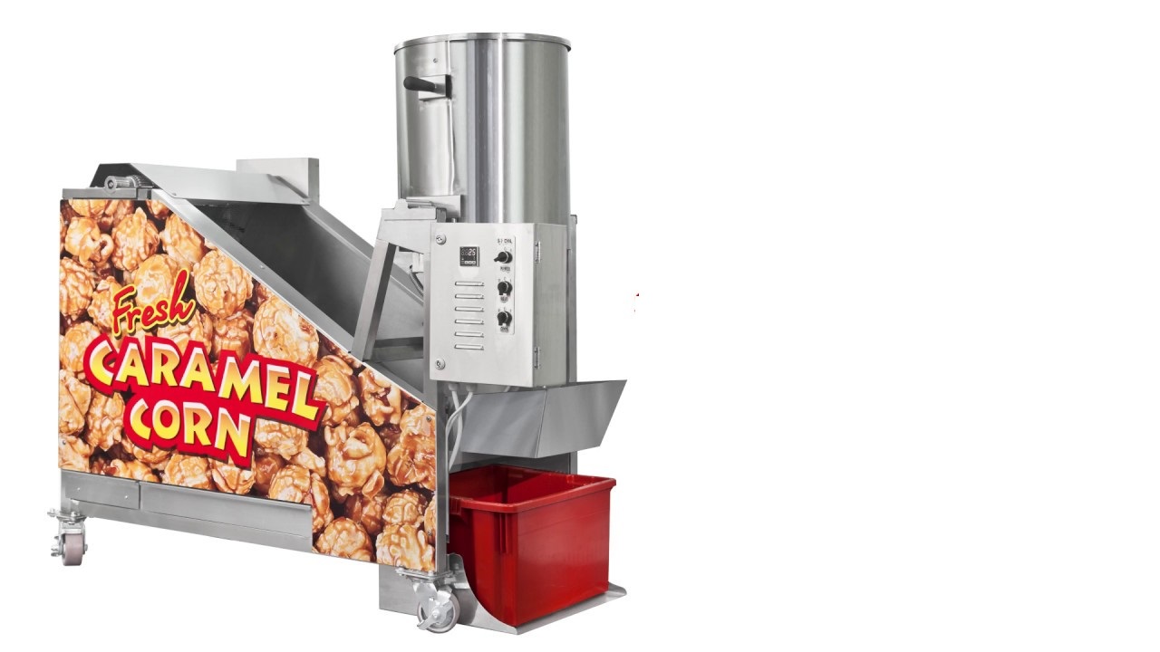 Изделие оснащено полуавтоматической обработкой попкорна загрузка/выгрузка, а также автоматическое охлаждение готового карамелизированного попкорна, автоматическая сепарация готовой продукции на конвейерной сетке, ручка для выгрузки обработанного попкорна.