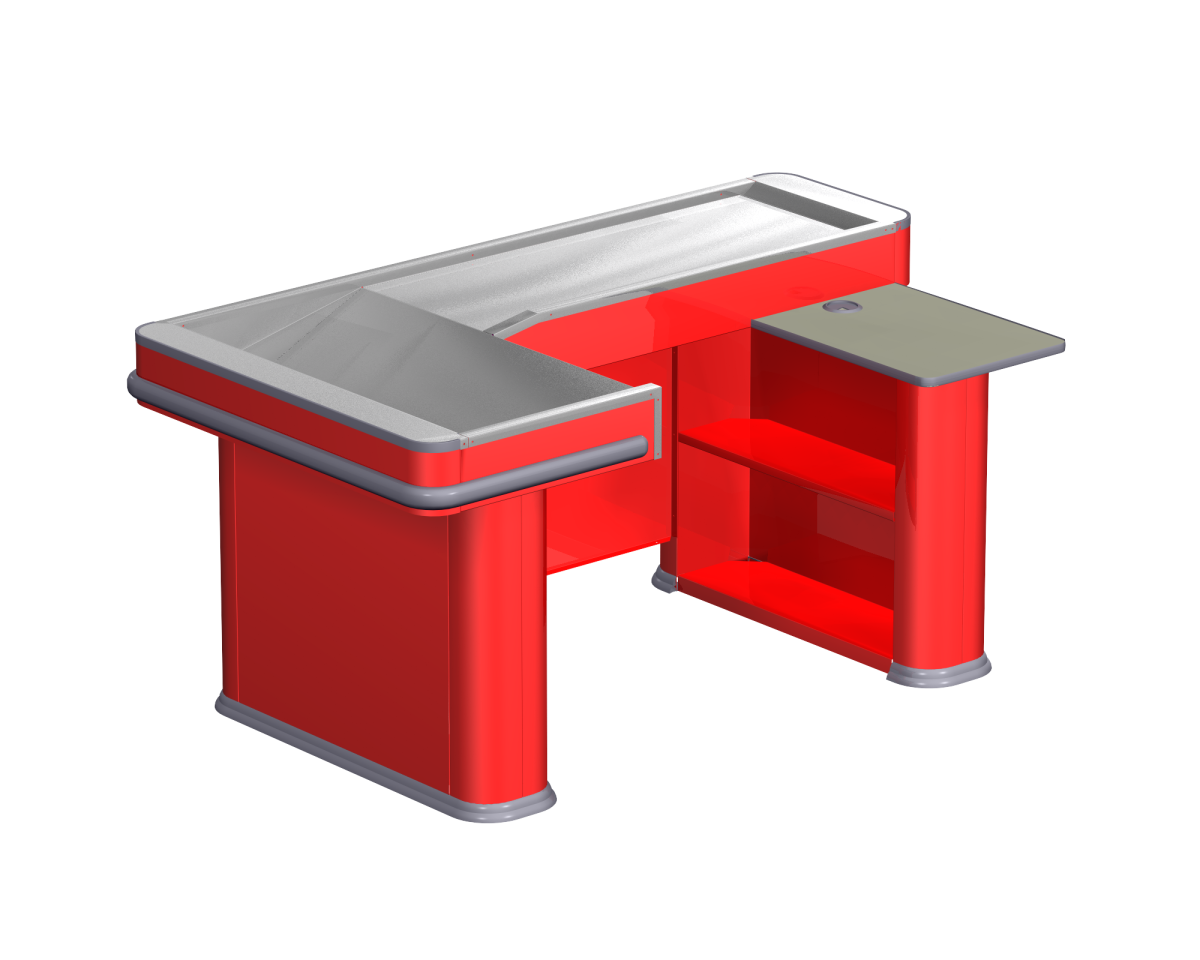 Широкий накопитель, разделитель покупок, узкий отбойник, пульт и педаль управления транспортером, ящик кассира, три розетки, боковая панель, полки в боксе.