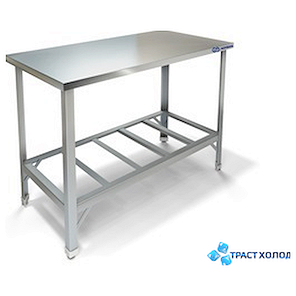 Столешница изготовлена из пищевой нержавеющей стали AISI 430, усилена ЛДСП толщиной 16 мм. Каркас изготовлен из оцинкованной стали, форма ножек уголок. Полка решетка изготовлена из оцинкованной.