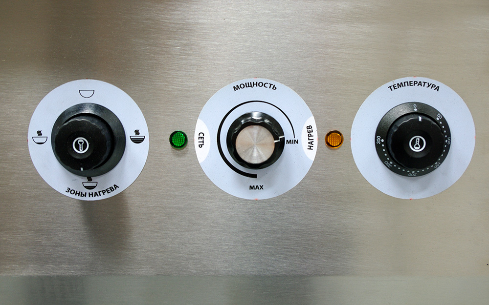 • Обновленная аналоговая панель управления: термостат от 50 до 300 градусов Цельсия, регулятор зон нагрева и регулятор мощности нагрева.