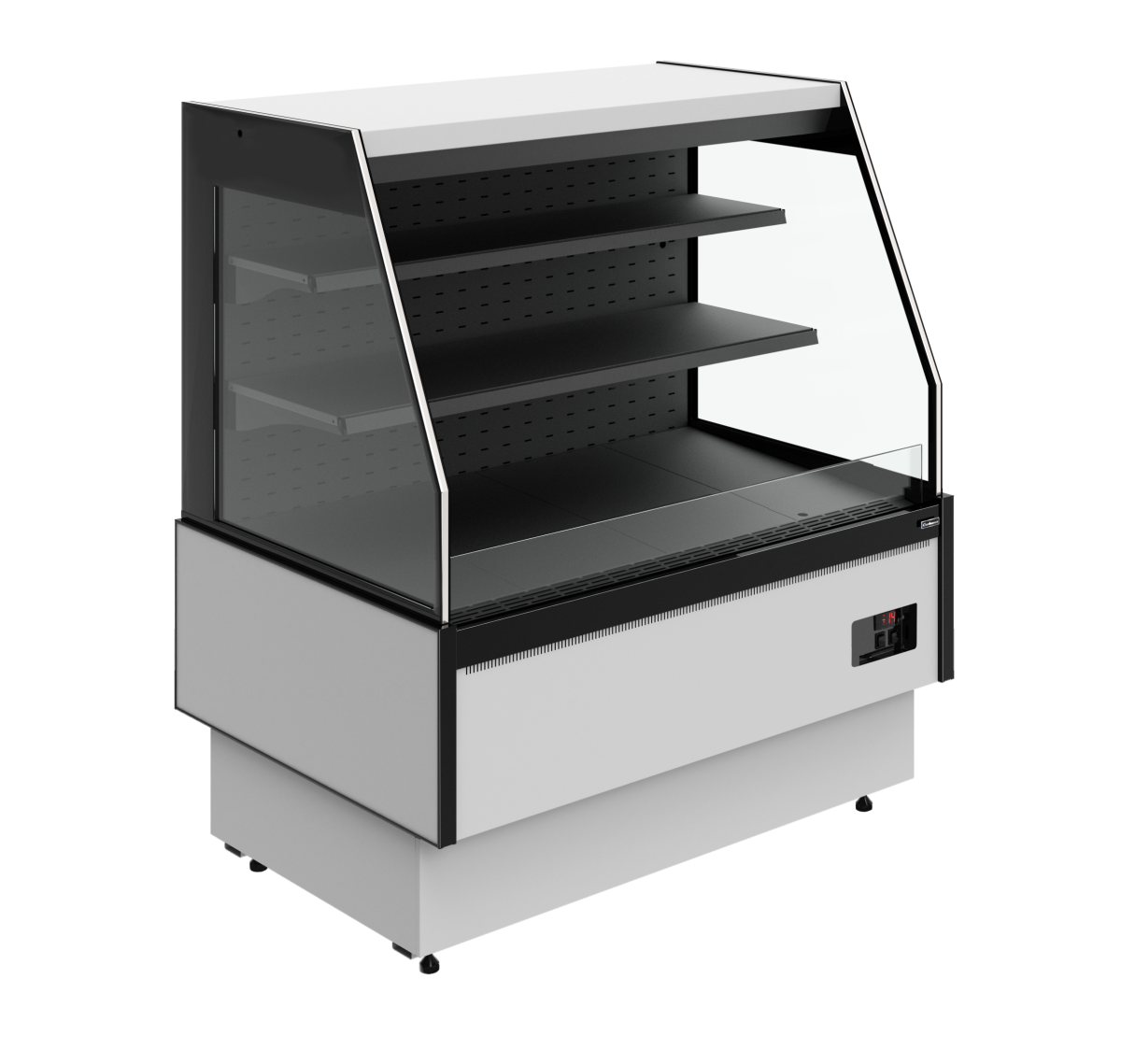 Стильная гастрономическая горка GC85 (PRAIA 2) с кубическим дизайном экономит пространство без потери функциональности, использует энергоэффективный газ R290, защиту стекла от запотевания и варианты облицовки под стиль вашего магазина.