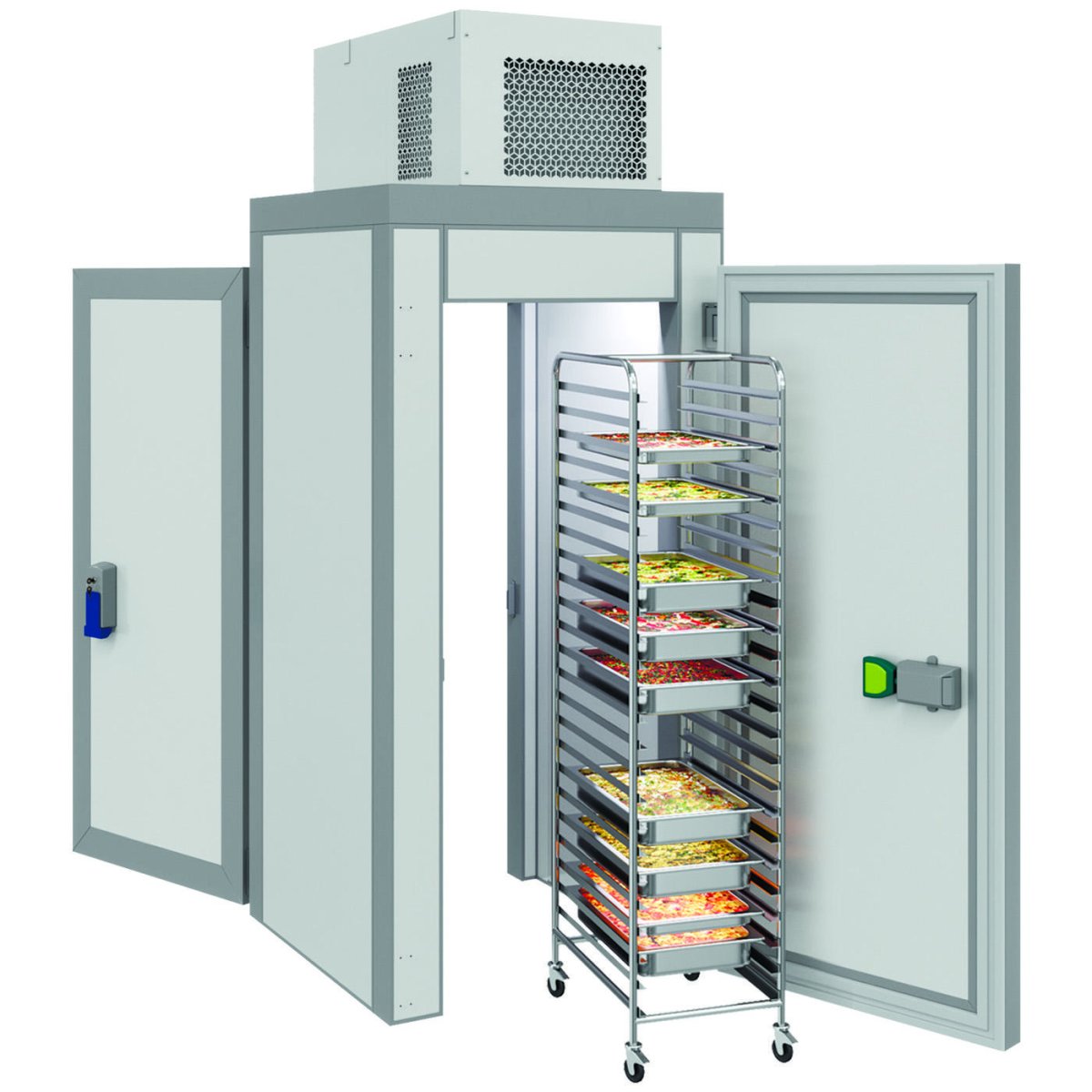 Внешняя обшивка выполнена из оцинкованной стали с полимерным покрытием, модульные панели из полиуретана с теплоизоляцией, внутреннее исполнение оцинкованная сталь с антибактериальным покрытием FoodProtect.