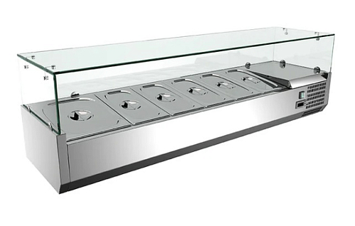 • Витрина холодильная настольная с 1 ярусом для ингредиентов с вместимостью 5*GN1/4 глубиной 150 мм (гастроемкости поставляются дополнительно).