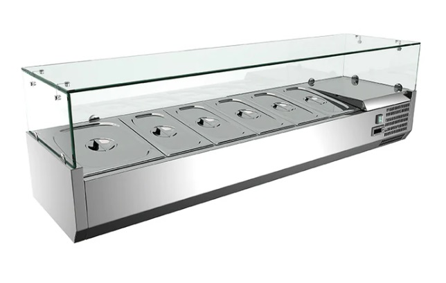 • Витрина холодильная настольная с 1 ярусом для ингредиентов с вместимостью 5*GN1/3+1*GN1/2 глубиной 150 мм (гастроемкости поставляются дополнительно).
