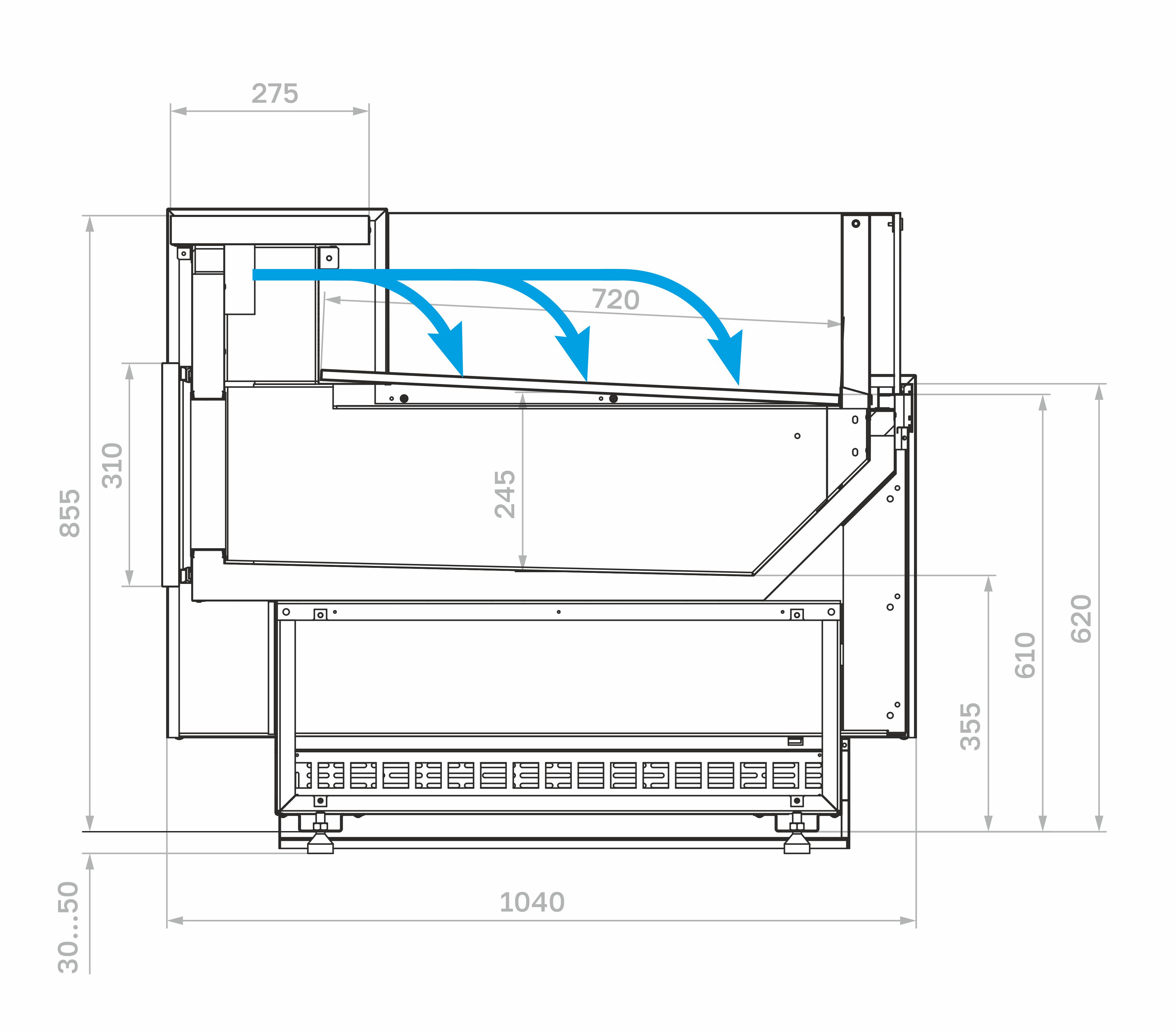 • 2х ступенчатые поддоны для выкладки. Общая высота поддона -120 мм, общая глубина-480мм