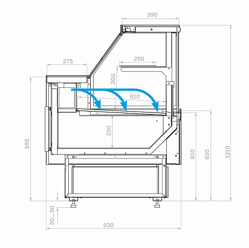 Эта торговая витрина сочетает в себе современный дизайн и передовые технологии, будучи универсальным решением для любого магазина. Ее стандартная глубина 930 мм позволяет легко вписать ее в существующее пространство.
