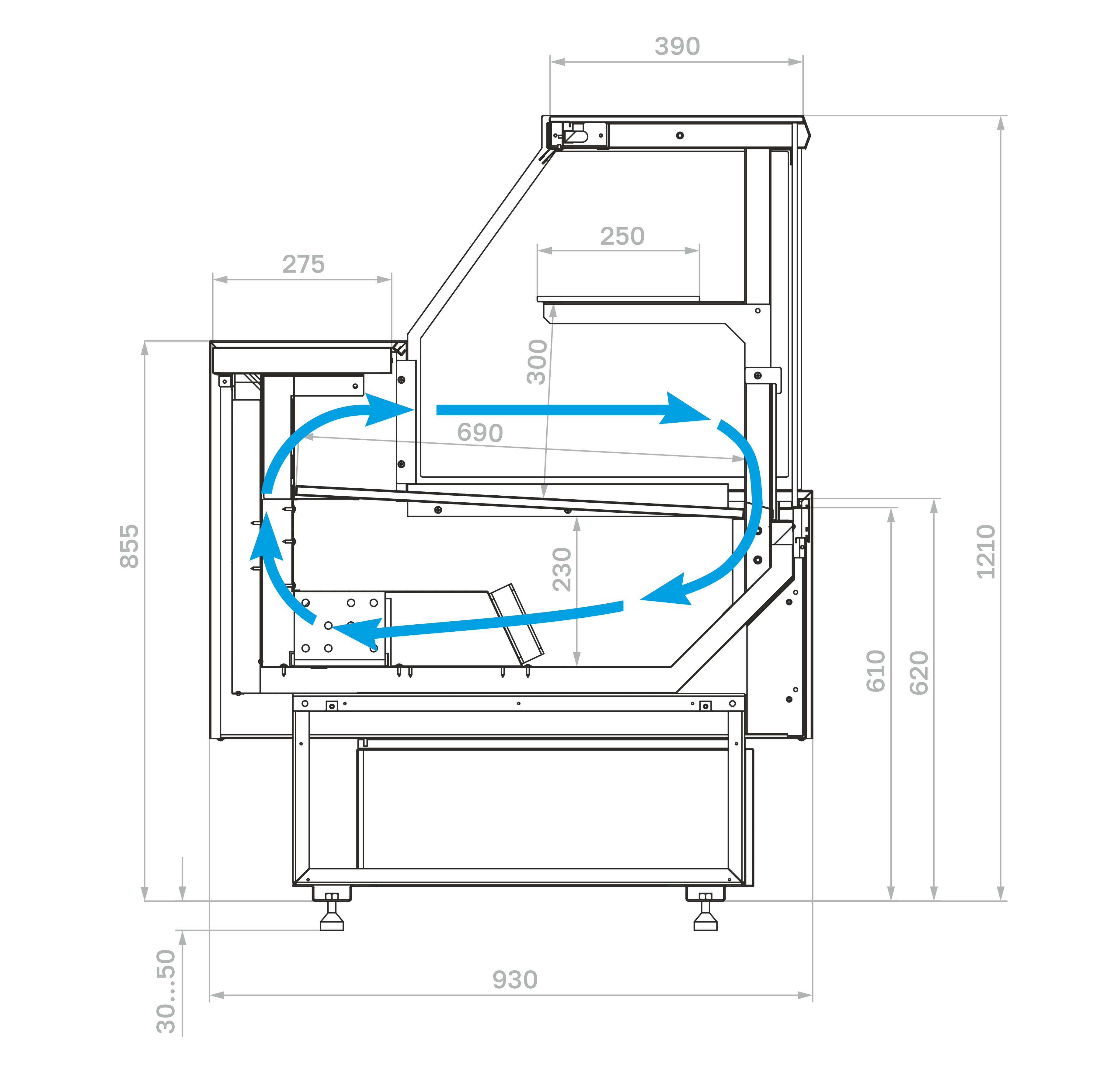 Эта торговая витрина сочетает в себе современный дизайн и передовые технологии, будучи универсальным решением для любого магазина. Ее стандартная глубина 930 мм позволяет легко вписать ее в существующее пространство.