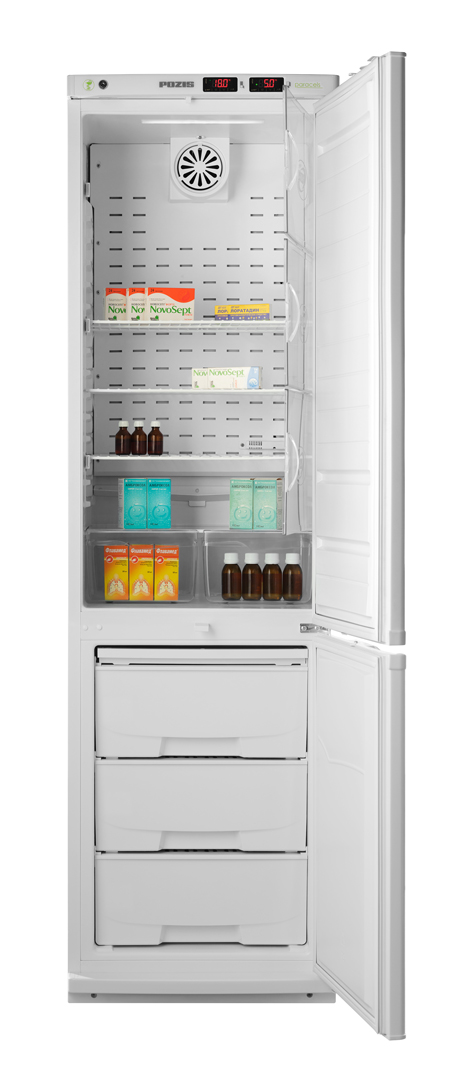 Холодильник лабораторный комбинированный POZIS ХЛ-340 (металл + металл) редназначен для работы в лабораториях различных направлений и диагностических центрах (ПЦР, биохимические, иммунологические и гематологические исследования), на станциях переливания крови и в серологических лабораториях, при оснащении аптек, аптечных производственных отделений и фармацевтических предприятий, прививочных кабинетов. Холодильник обеспечивает потребность в хранении лекарственных препаратов, средств, образцов, тест-наборов и других фармацевтических средств при температуре от +2°С до +15°С в холодильной камере и при температурах от минус 10°С до минус 25°С в морозильной камере. Основные характеристики: 2 микропроцессорных регулятора температур со сверхчувствительными датчиками температуры, система принудительной циркуляции воздуха в холодильной камере, в холодильном отделении дверь стеклянная с замком, в морозильном отделении дверь металлическая с замком, автоматическое поддержание температуры в камерах, сигнализация при отклонении температуры от заданной, отображение температуры на табло панели управления, отключение вентилятора при открывании двери; прозрачные дверки, закрывающие полки по высоте всего объема.