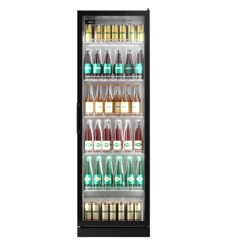 • Стеклянная распашная дверь с закалённым стеклопакетом и вертикальная LED-подсветка обеспечивают высокую видимость напитков по всей высоте шкафа. Конструкция ориентирована на демонстрацию бутылочной и баночной продукции — от воды и безалкогольных напитков до пива и охлаждённых вин.