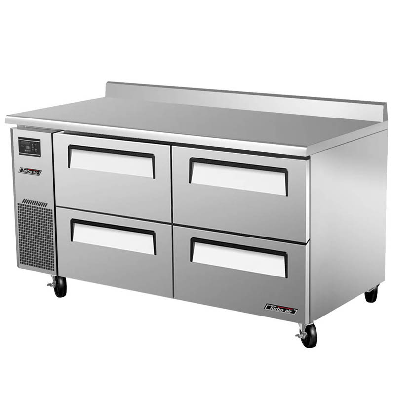 Холодильный стол Turbo air KWR15-2D-4-700 с ящиками и бортом, состоит из рабочей поверхности, на которой можно раскатывать тесто и обрабатывать ингредиенты для приготовления блюд, и камеры, предназначенной для охлаждения и кратковременного хранения скоропортящихся продуктов и напитков на предприятиях пищевой промышленности, общественного питания и торговли.