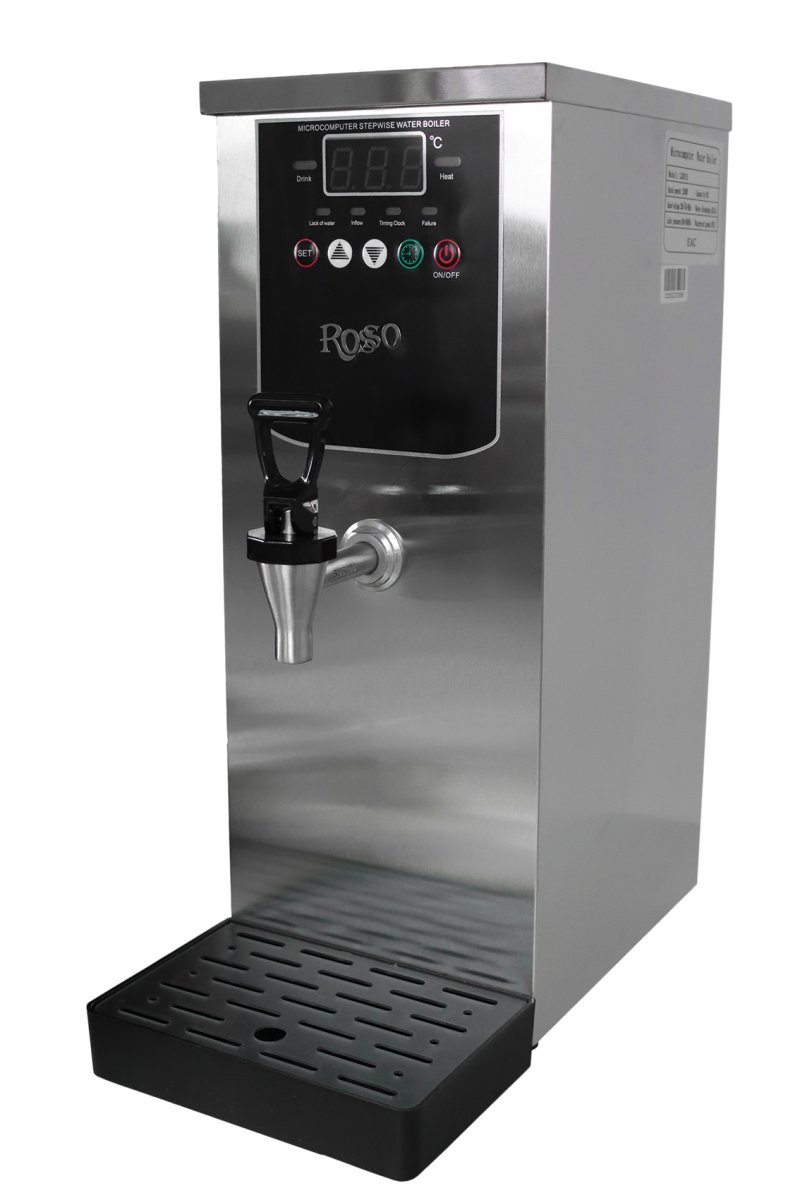 Кипятильник электрический проточный Rosso LXB015, серебро предназначен для быстрого нагрева воды и поддержания ее температуры в течение длительного времени. Кипятильник требует подключения не только к электросети, но и к водопроводу, и позволяет непрерывно разливать кипяток, не заботясь об уровне воды в резервуаре. Настольный электрокипятильник оптимален для линий раздачи ресторанов, кафе, столовых, закусочных. Он также идеально подойдет для приготовления горячих напитков в барах и оснащения детских садиков, школ, офисов и больниц. Кипятильник ROSSO работает по принципу ступенчатого нагрева воды. Электроды в каждой ступени посылают сигнал на микрокомпьютер, который, обрабатывая сигналы, активирует нагревательный элемент и электромагнитный клапан, тем самым регулируя температуру и объем подачи воды. Таким образом, вода, нагретая на одном уровне, закипает. Затем нагревается следующий уровень, в результате формируется ступенчатый цикл нагрева. Такая технология позволяет избавиться от повторного нагрева воды и экономит её потребление. 25л/ч
