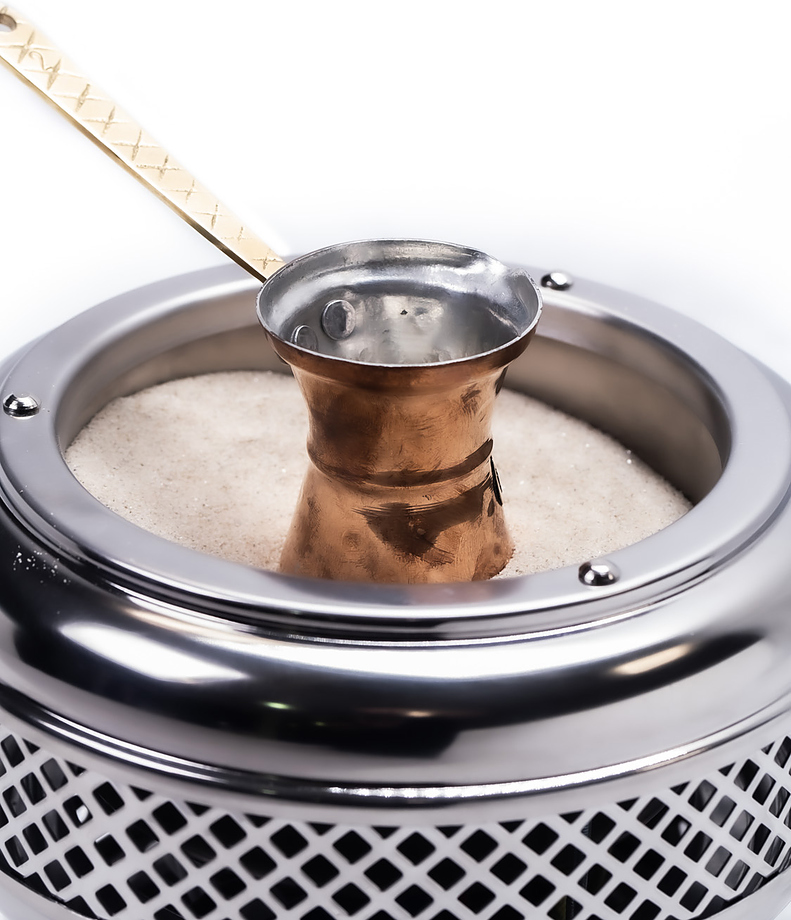 Кофе на песке JOHNY AK/8-5 хром используется для приготовления кофе по-восточному (на песке) в специализированных кофейных заведениях. Благодаря равномерному прогреву и медленному томлению напиток приобретает натуральный яркий вкус и насыщенный аромат. В комплект входят песок массой 0,56 кг и 1 турка на 100 мл.