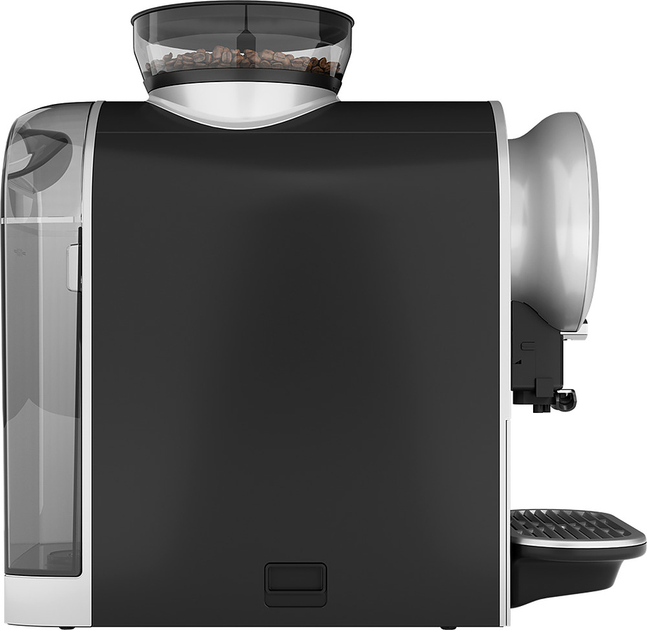Модель оснащена сенсорным экраном с опциями настройки крепости, объема напитка и размера помола. Корпус выполнен из нержавеющей стали и пластика, не содержащего BPA.