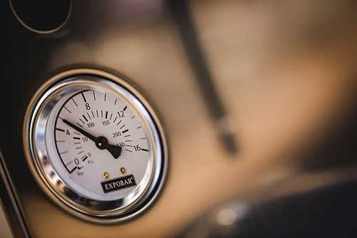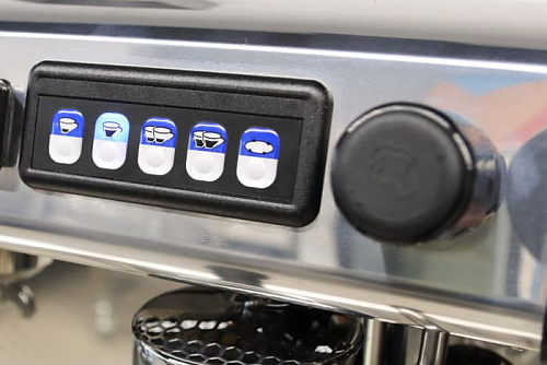 Управление группами осуществляется с помощью клавиш. Подача пара и горячей воды регулируется поворотными ручками. Для контроля температуры и давления в панель встроен манометр с двойной шкалой. Сверху расположена удобная полка для чашек и аксессуаров.