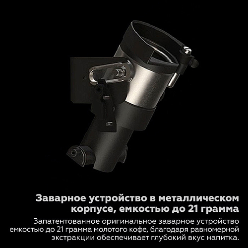 Съемное заварочное (центральное) устройство в металлическом корпусе. Максимальная загрузка заварного устройства – 21 гр. Заваривание возможно с высокой, средней или низкой экстракцией (повышение рабочего давления увеличением производительности помпы).