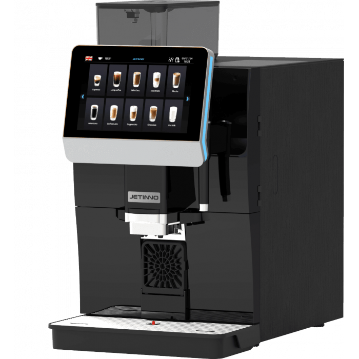 Высокоточная кофемолка и мощная помпа обеспечивают стабильное качество, сравнимое с профессиональными кофейнями. Совместимость с кофегруппами Jetinno позволяет гибко настраивать рецепты, а двойная система бойлеров создаёт идеальную молочную пену для капучино и латте. Регулируемая высота раздаточного узла (7–15 см) позволяет использовать чашки и стаканы разных размеров, что удобно в условиях высокой проходимости.