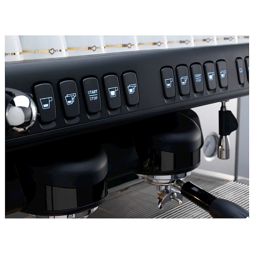 Машина имеет электромеханическую панель управления с отдельными кнопками для каждой группы, которые позволяют регулировать дозировку кофе и воды. Устройство оборудовано высокопроизводительным независимым бойлером с четким контролем температуры и подачи воды и пара, а также панелью подогрева чашек для лучшего раскрытия вкуса и аромата напитка.