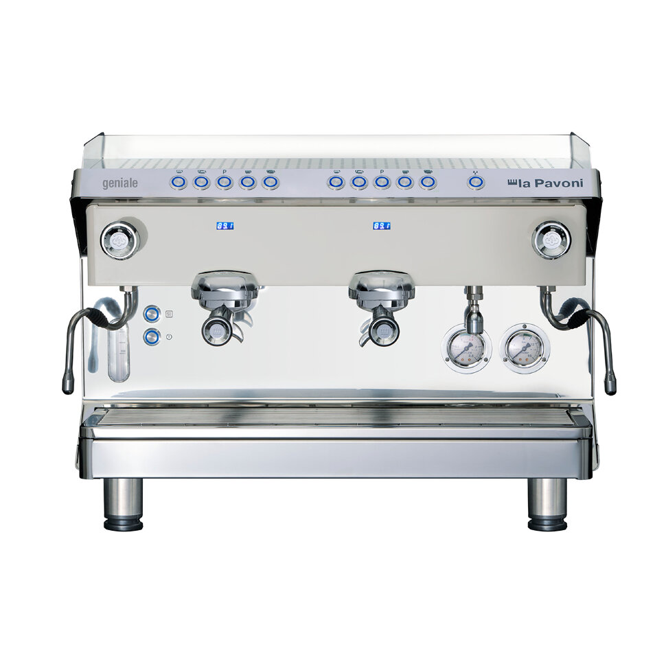 Автоматическая кофемашина La Pavoni GENIALE2VBEU с технологией Thermopid используется на предприятиях общественного питания и торговли, в офисах для приготовления различных кофейных напитков. Медный бойлер оснащен теплообменниками и передними форсунками для каждой группы, а также автоматической дозировкой кофе, воды/пара. Корпус изготовлен из нержавеющей стали AISI 304 с литыми никелированными латунными группами, каплесборник с решеткой из нержавеющей стали AISI 304.
