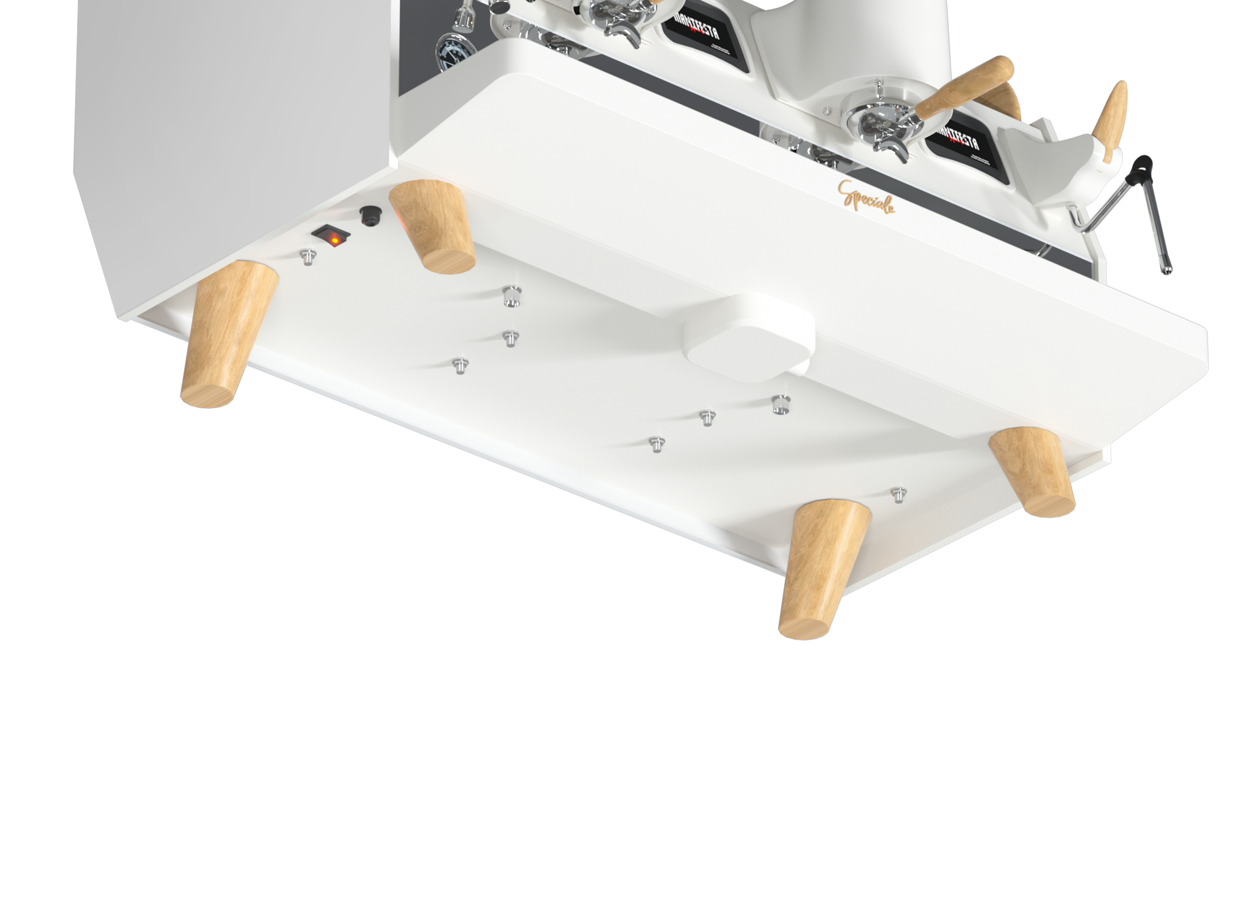 Корпус выполнен из искусственного белого мрамора и нержавеющей стали, ручки холдеров и паровых кранов - из дерева, бойлеры - из нержавеющей стали.